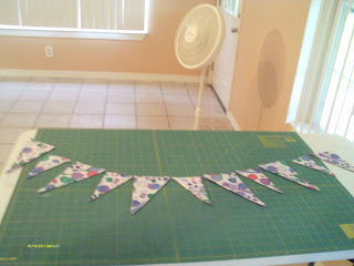 I used the rulers 30 degree line to make the cuts. Once all the triangles were cut, I sewed the pink and green triangles right sides together. You can go down one side and up the other. Remember to trim off the point of the triangle to make turning. Leave the top open and turn. Do this to all remaining triangles. Then, I made a 1/2" double bias binding for the top.